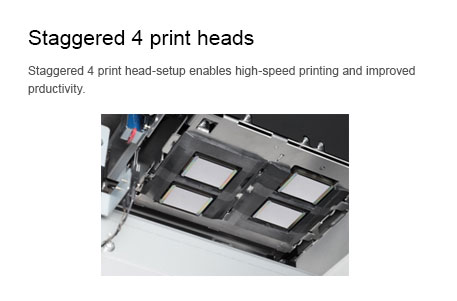 Thiết kế 4 đầu in so le cho phép in ở tốc độ cao và cải thiện năng suất giúp máy VJ-1948WX đạt đến tốc độ in tối đa 117.3m²/h*.