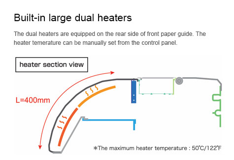 Lò sấy đôi lớn kết hợp tại mặt sau của thanh dẫn giấy phía trước và cung cấp thời gian sấy cũng như tốc độ in nhanh hơn.